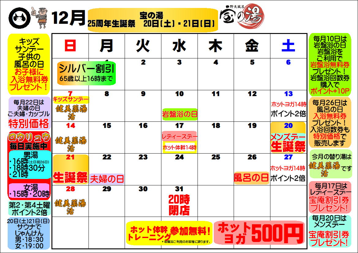 ・今月のメンズデー(毎月20日)は『宝庵割引券プレゼント!』*入浴料は通常通り円です。