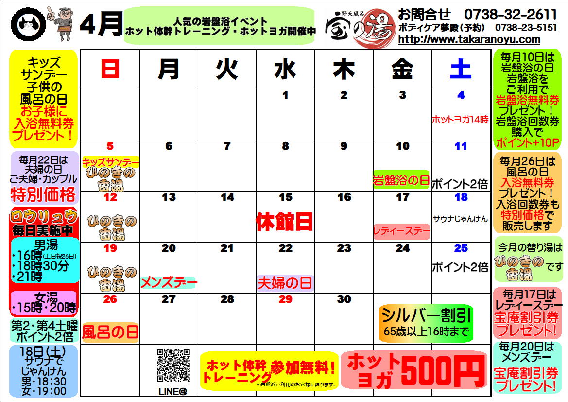 ・今月のレディースデー(毎月17日)は『宝庵割引券プレゼント!』*入浴料は通常通りです。